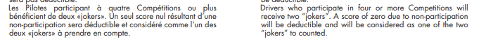 le problème ici c'est que le texte français dit ce que le texte anglais (et la FIA) aurait probablement voulu dire, mais il ne le dit pas ! (et encore heureux, car le texte anglais est beaucoup plus adapté à un championnat d'amateurs)Micol a écrit : lun. 30 août 2021 22:01Oui, j'avais vu ça aussi.pWe a écrit : lun. 30 août 2021 21:08 ce qui est bien plus compliqué c'est de comprendre le règlement du CEM au niveau du décomptage. d'autant plus que le texte qui fait foi est la version anglaise qui ne dit vraiment pas exactement la même chose que la version française.