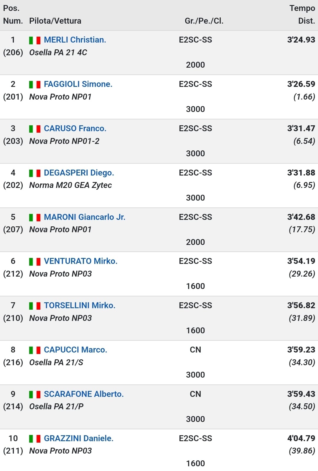 Le champion toscan, devant son public, avec la Nova Proto Np01-Zytek a arrêté le chrono en un superbe 3'19"44 à une vitesse moyenne de 152,5 kilomètres par heure, donnant 6'29" à Degasperi, auteur d'un excellent 3'25"73, suffisant pour garder derrière lui le rapide sicilien Franco Caruso, crédité de 3'27"39 sur Nova Proto Np01/2-Zytek.