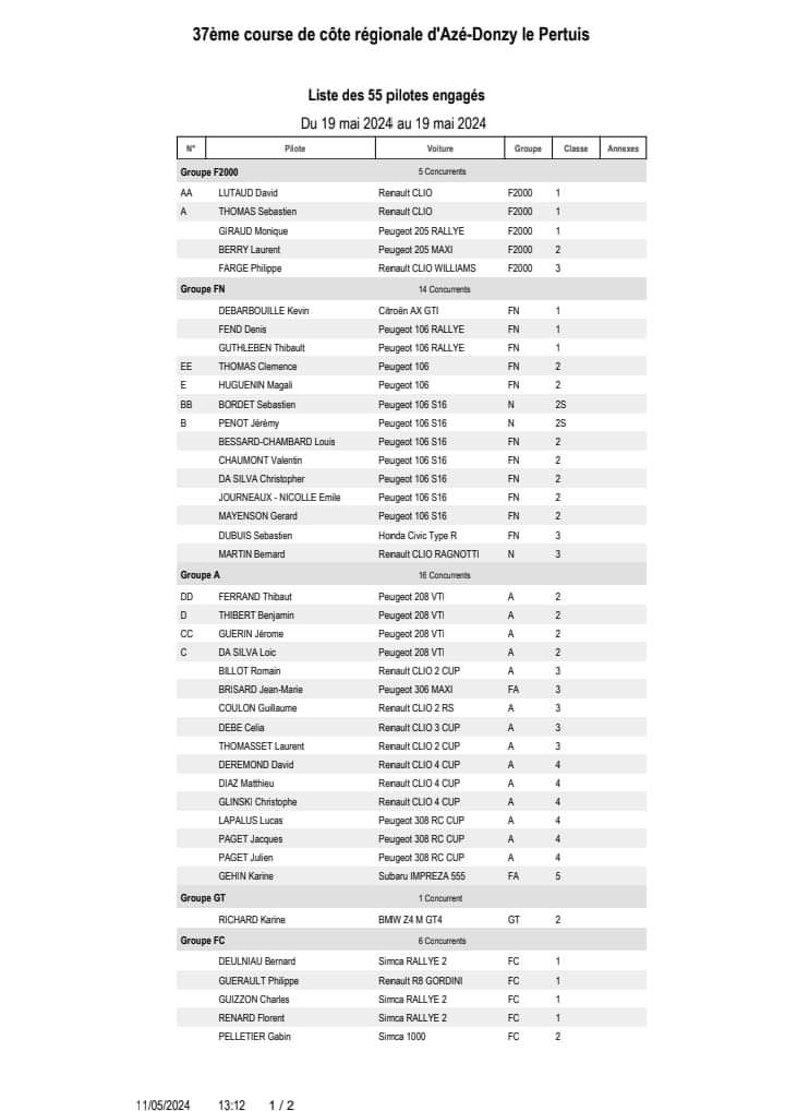 me concernant c'est tjs dans l'amélioration du réseau électrique ! pour le soleil...disons que la météo serait du: comme aime le n⁰47 de Coligny .maintenant oui la liste est maigrichonne mais!l'an dernier à même date il y avait 49 voitures et 100 au finale. présence de fabien bourgeon en double monte avec j.m Tissot et encore deux belles surprises mais...silence radio pour l'instant.