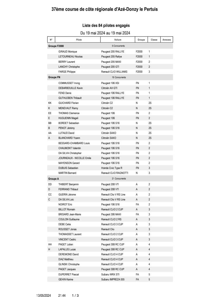 Dimanche 19 mai 2024, de 8h à 19h, course de côte Azé-Donzy. Essais + 4 montées chronométrées. Entrée gratuite. Parking et navettes gratuites. Samedi de 19 à 21h repas sur place 16€ ou à emporter 11€ au parc pilotes, réservation au 06.08.50.01.51, organisé par CODA 71. Samedi en fin d'après midi, dégustations des vins de la cave d'Azé(notre principal sponsor), au parc pilotes