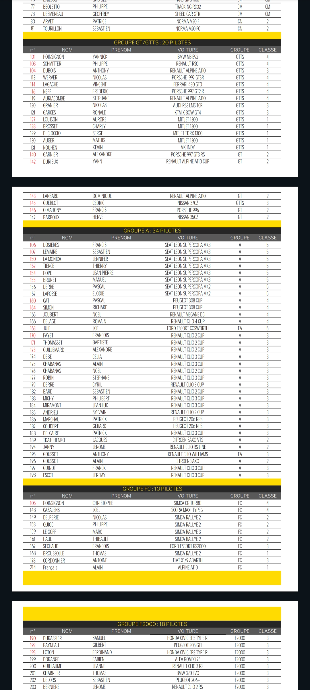Liste des inscrits, à noté la présence d'un de nos membres Sébastien Ganhito en VHRS qui avait obtenu un très bon résultat l'année passée. En GTTS un plateau de grande qualite avec trois champions dont Yannick Poinsignon Nicolas Werver et Ronald Garces