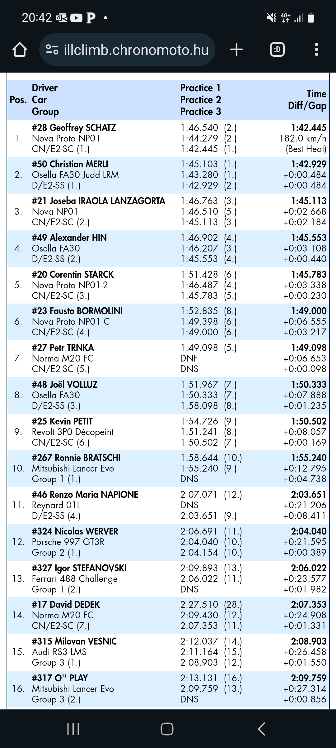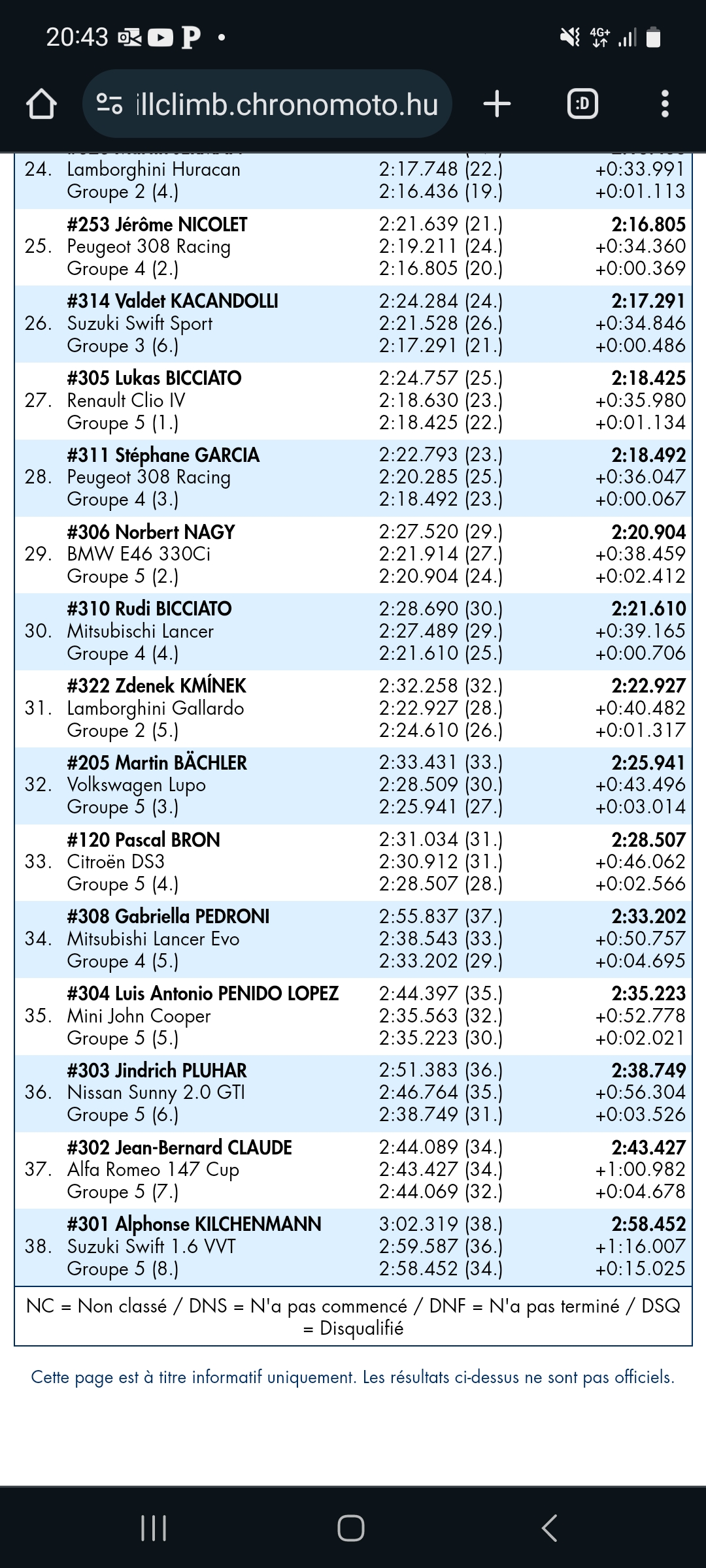 Vu la complexité, des limiteurs de régimes,ou pas puis des brides ou pas, puis de l aero ou pas, etc etc, je pense que m pour l électrique, ils arriveront à faire compliqué... Du coup le plateau européen déjà famélique disparaîtra, et on ne pourra m plus reclasser autos en fc, ou f 2000,ou DE4, car les auront fait disparaître...Daniel de Besançon a écrit : sam. 17 août 2024 11:36Mais en Europe c'est Merli, Schatz car Faustini est en réglementation Suisse ( pas de bride ) donc pas classé en Europe.raoul68 a écrit : sam. 17 août 2024 11:08 1 er essais Merli Faustini Schatz. Ronnue Bratschi, Nicolas Werver.