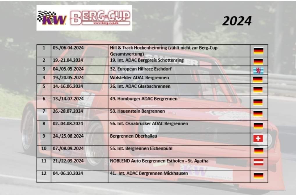 pour rappel : la KW Berg-Cup est une série privée et à ne pas confondre avec le championnat officiel d'Allemagne des courses de côte. les calendriers diffèrent légèrement (par exemple Oberhallau en Suisse ne fait pas partie du championnat d'Allemagne, mais uniquement de la KW Berg-Cup, I-Berg début juin fait partie du championnat d'Allemagne mais a décidé de ne pas intégrer le calendrier de la KW Berg-Cup)