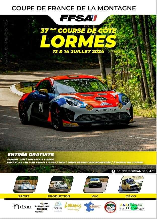 l’Ecurie Morvan des Lacs organise pour la 37ème année sa course de côte de Lormes le week-end du 13-14 juillet 2024.