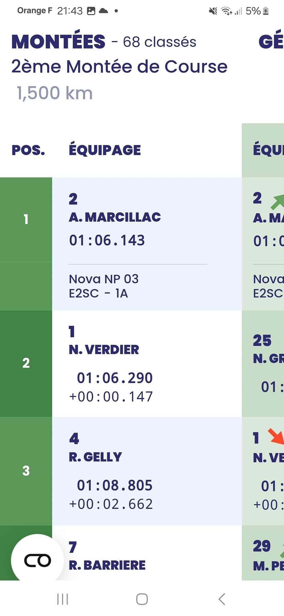 Partie pour essayer de me rapprocher de mon plus grand rival Géraldine Nicolas Verdier ,la première montée de course c'est lui devant avec 0.280 devant moi tout était partie pour se bagarrer,à la suivante chose faite je tombe un temps en 1.06.143 tout comme lui mais un peu moins vite en 1.06.290 rien nous départageais mais pour gratter ce peu c'est très compliqué , je préfère pas risquer pour la dernière on vera bien fin de la course. Il améliore pas je gagne la belle sur 4 courses à se battre au dixième près face au talentueux M . Verdier