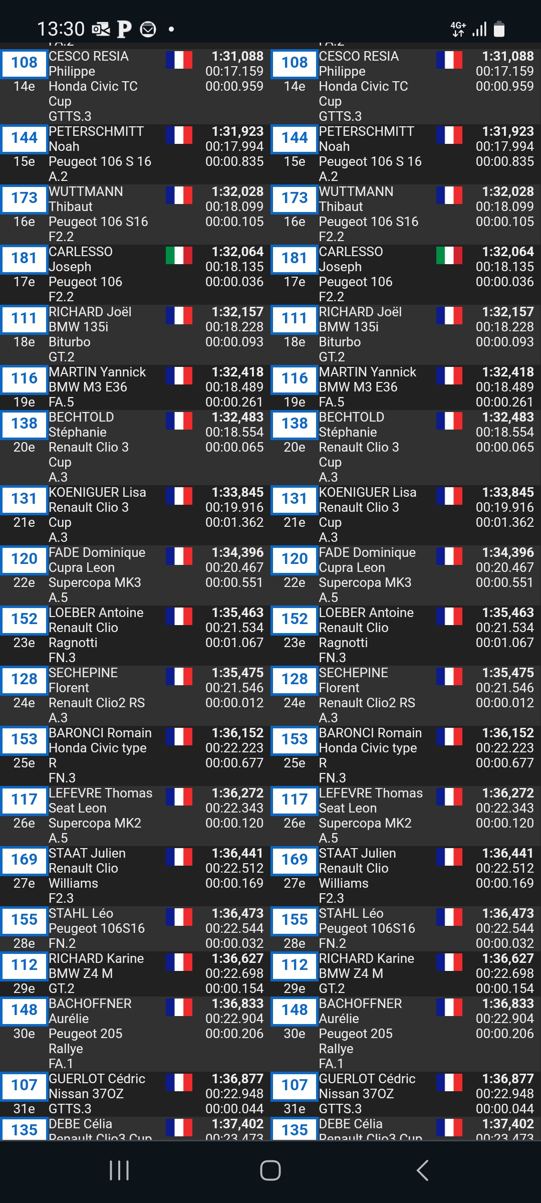 Mauvaise nouvelle, sortie de Loic Cordier, la voiture semble abîmée le pilote s'en extrait seul. Il nous avait fait un très beau passage à la première épingle. Il est sorti juste avant la dernière.